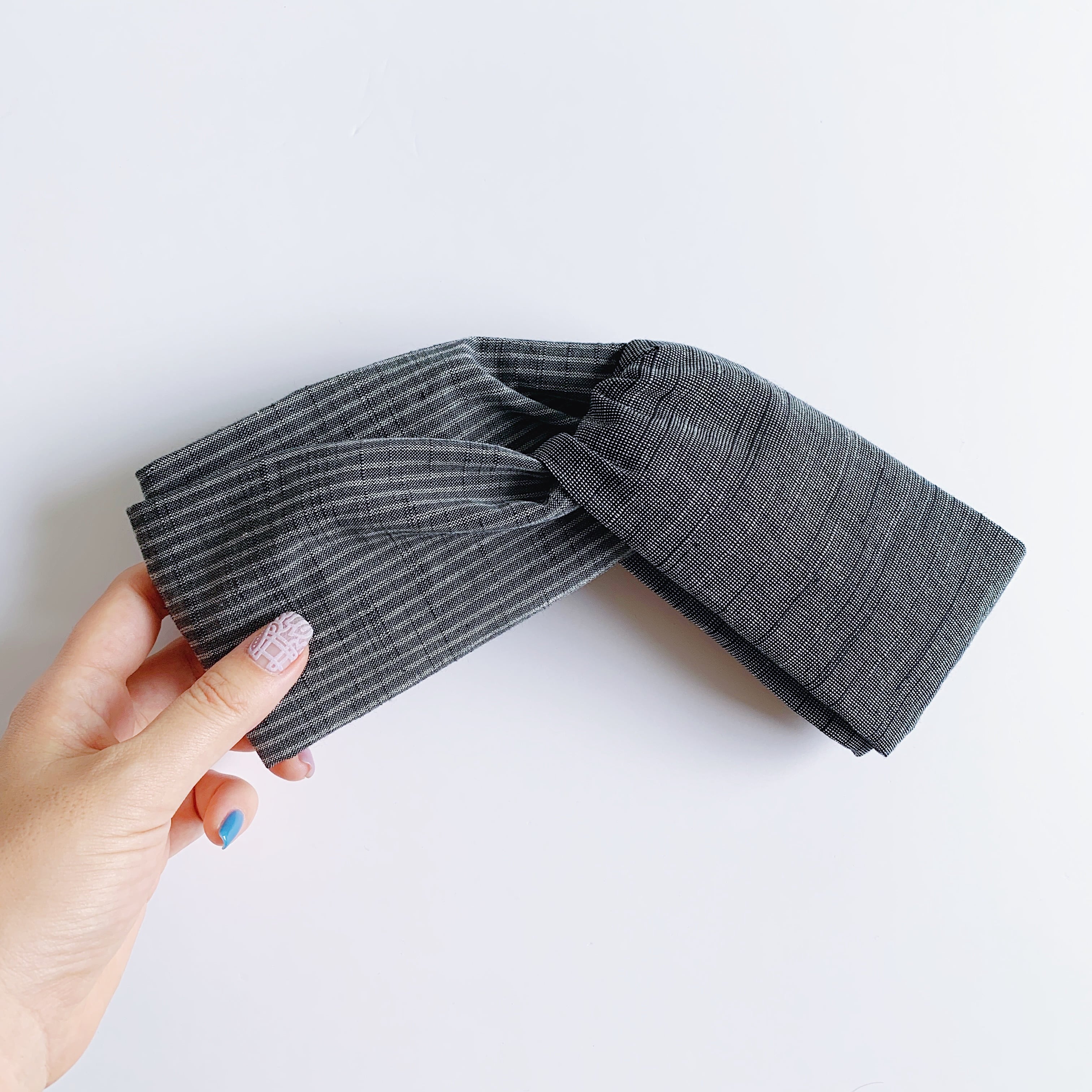 濃いめの細いグレー縞にブラックのスラブ木綿を合わせました。主張しすぎない落ち着いた縞模様なので様々なコーディネートに合わせやすい色味のターバンです。
